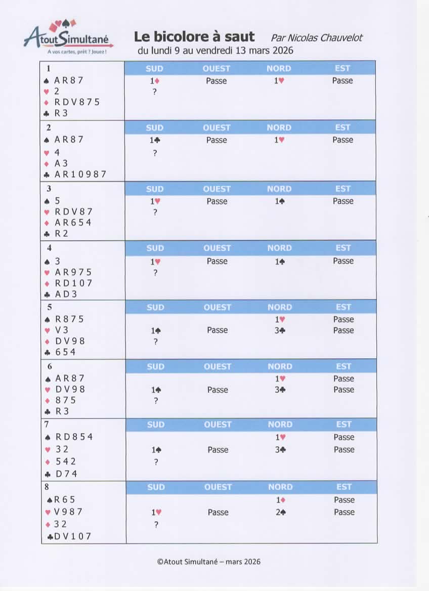 As usual, we will begin at 2 pm with the Quiz (see main article or click here) - this time on the "jump 2-suiter bid" ("bicolore a saut"). Play will start at 2.30 and, for those who can stay on, we will have a little cocktail afterwards.